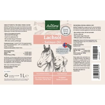 AniForte Lachsöl für Hund, Katze und Pferd ist eine rein natürliche Ergänzung der täglichen Ernährung Deines Tieres. Du kannst das Öl ganz einfach bei der normalen Fütterung oder auch beim Barfen dazugeben. Die im Lachsöl enthaltenen essenziellen Fettsäuren tragen dazu bei, dass Hund, Katze und Pferd optimal bei der Haut- und Fellgesundheit unterstützt werden.