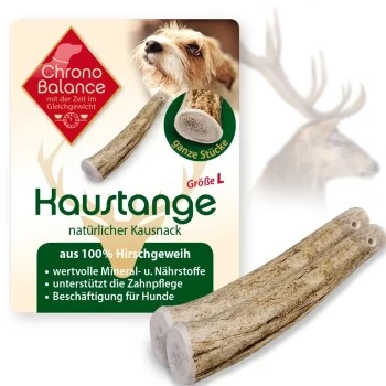 Die ChronoBalance Kaustangen aus 100% Hirschgeweih werden nur aus abgeworfenen Hirschgeweihen gefertigt – keine Schlachttiere. Rehböcke sowie Rot- und Damhirsche werfen ihr Geweih einmal im Jahr auf natürliche Weise ab. Die aus dem Wald von Hand gesammelten Geweihstangen werden dann abgeschliffen und in die richtigen Größen zurechtgeschnitten, um einen hochwertigen Kauknochen für jegliche Art Hunde zu garantieren. Das Innere der Geweihstange steckt voll von wertvollen Mineral- und Nährstoffen, welche von Hunden heraus gekaut werden können.