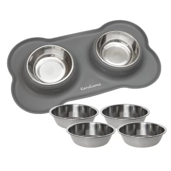 Das KaraLuna Napfset besteht aus einer hochwertigen Silikon Napfunterlage und herausnehmbaren Edelstahl Näpfen. Der erhöhte Mattenrand hält Wasser und Futter auf der Napfmatte und schont dadurch den Boden. Die KaraLuna Futternapf Unterlage besteht aus Silikon. Silikon ist sehr rutschfest (auch auf glattem Boden), geruchsneutral, faltbar, fussbodengeeignet, robust und spülmaschinengeeignet. Die Näpfe bestehen aus Edelstahl. Dadurch sind sie bruchsicher, kratzfest sowie spülmaschinengeeignet. Dank der 2 Extra Näpfe* ist die KaraLuna Napfunterlage mit Napf jederzeit einsatzbereit (* bei 250ml und 400ml insgesamt 4 Napfeinsätze inklusive / bei 850ml 2 Napfeinsätze inklusive, 850 ml Zusatznäpfe separat bestellbar).