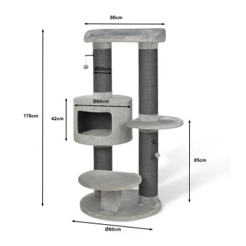 Der robuste Kratzbaum Henry hat eine besonders stabile Bodenplatte, die für einen sicheren Stand sorgt. Drei verschieden große Liegeflächen und eine kuschelige Höhle laden zum verweilen auf unterschiedlichen Ebenen ein. Vier hohe Sisalsäulen für den Kratztrieb und zwei kleine Spielbälle runden den Bedarf deiner Katze ab.