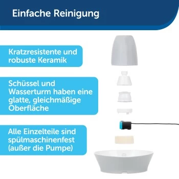 Halten Sie Ihr Haustier mit dem PetSafe® Trinkbrunnen Streamside gut hydriert, gesund und zufrieden. Der Trinkbrunnen stellt sicher, dass Ihrem Haustier jederzeit frisches, gefiltertes Wasser zur Verfügung steht. Katzen und Hunde finden fließendes Wasser in der Regel interessant. Es regt sie an, vermehrt zu trinken, was allgemein für ihre Gesundheit förderlich ist. Mit einer Wasserkapazität von 1,8 Liter eignet sich dieser Trinkbrunnen optimal für Katzen oder kleine Hunde. Der Turm sorgt für einen angenehm leise sprudelnden Wasserlauf, der auch scheue oder schüchterne Haustiere zum Trinken anlockt. Der mit einer Pumpe betriebene Trinkbrunnen ist mit einem Aktivkohlefilter und einem Schaumfilter ausgestattet. Diese halten das zirkulierende Wasser frei von Tierhaaren, Speichel und unangenehmen Geschmäckern.