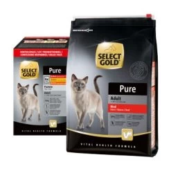 Die Rezepturen der SELECT GOLD Pure Premium-Nassnahrung enthalten bis zu 72% einer ausgewählten tierischen Proteinquelle (z.B. Huhn oder Rind) und verzichten bewusst auf den Einsatz von Kohlenhydraten in Form von z.B. Getreide, Gemüse oder Kartoffeln, sodass sie für besonders ernährungssensible Katzen geeignet sind.