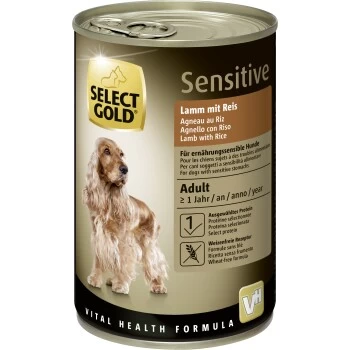 SELECT GOLD Sensitive Nassnahrung ist die Lösung für Hunde, die zu Futtermittelunverträglichkeiten oder sensibler Verdauung neigen.